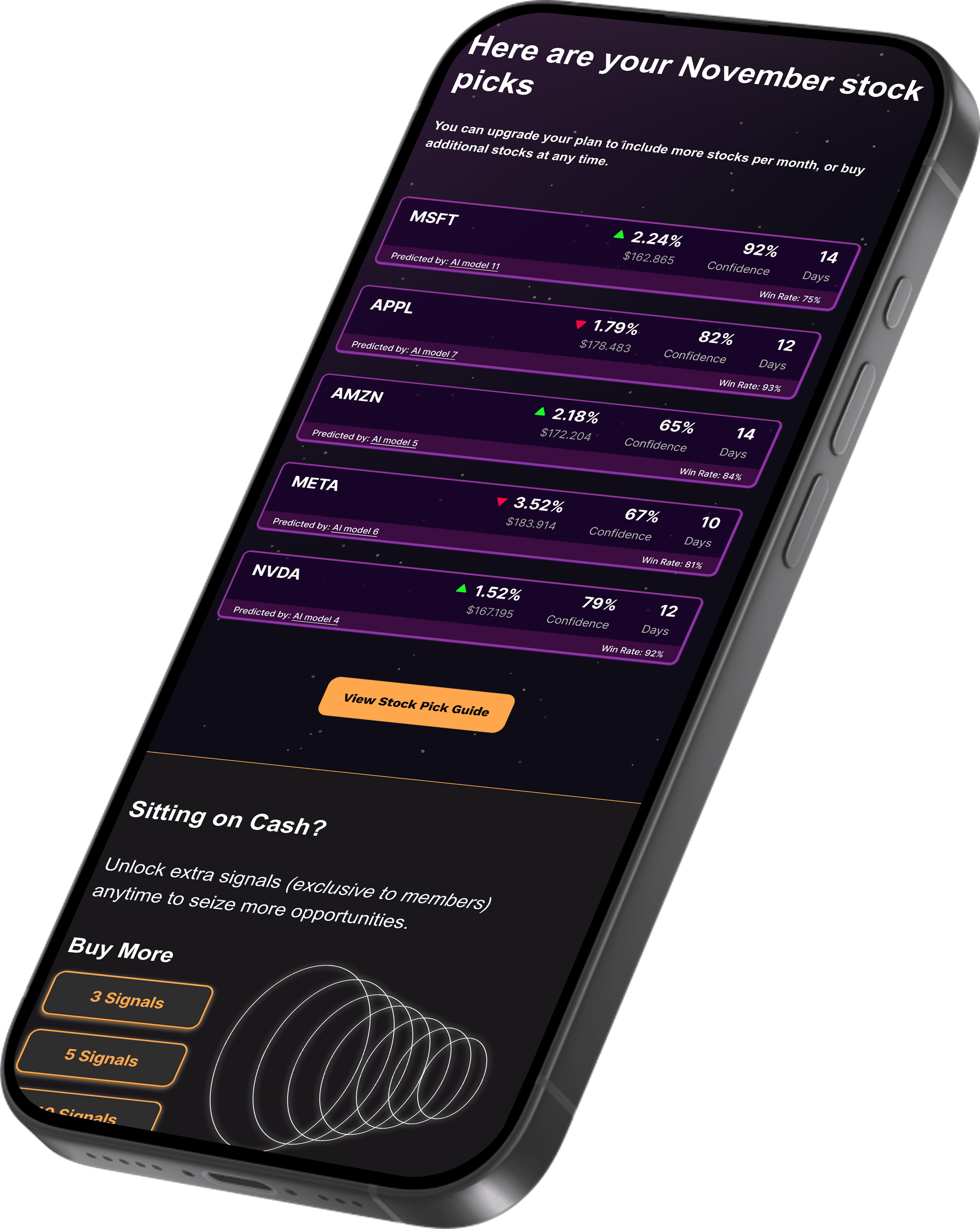Each signal provides you with essential information to make informed trading decisions: the stock ticker, target percentage, confidence level, and duration.